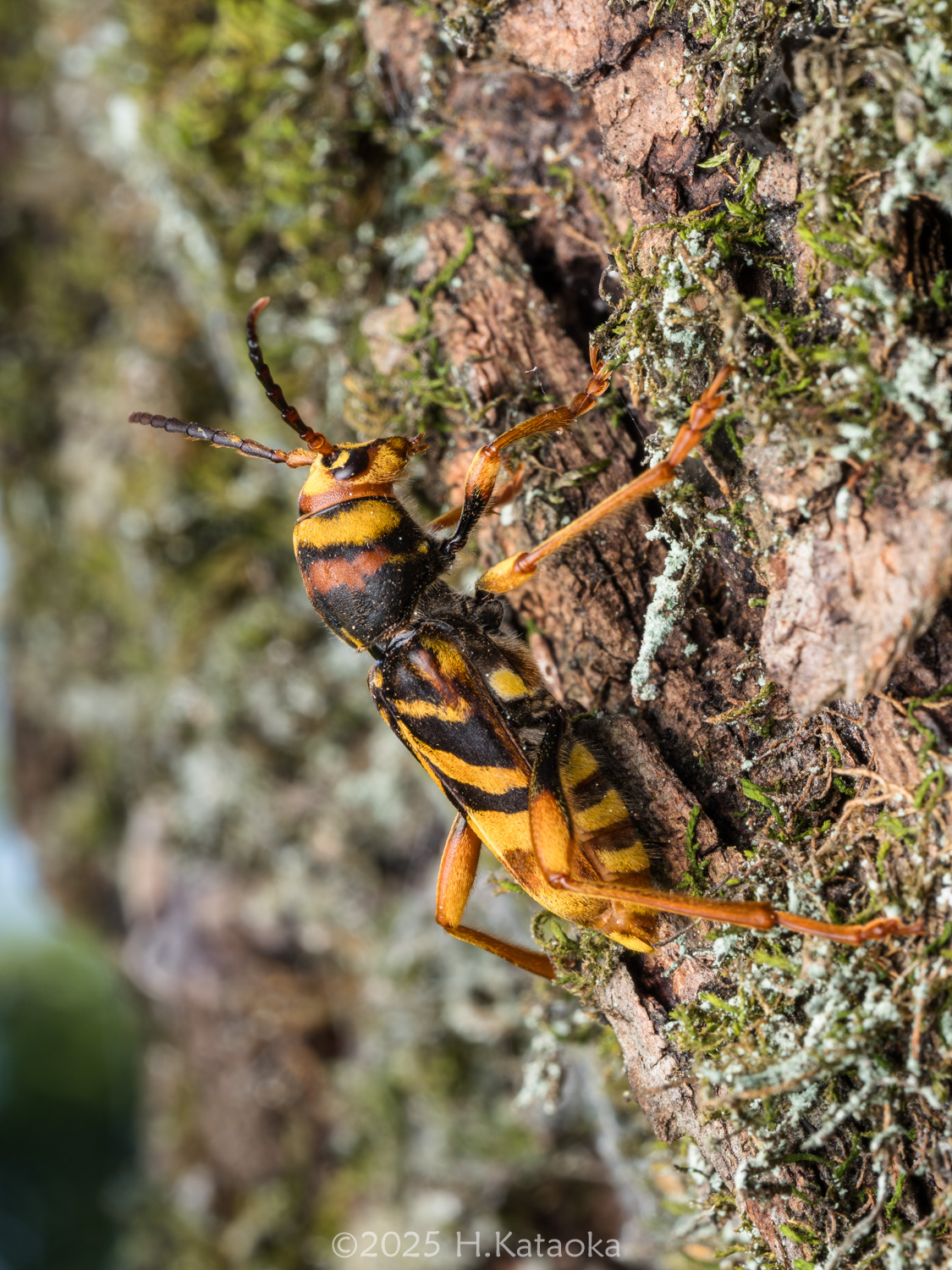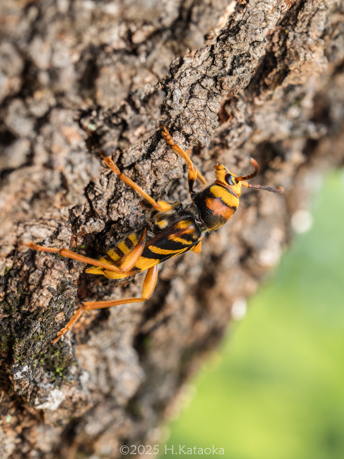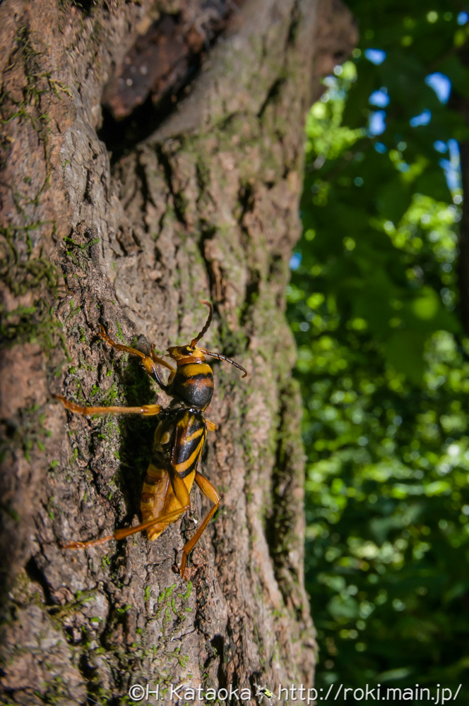 スズメバチに擬態した大型のトラカミキリ。平地~丘陵地で普通に見られ、クワ・ヤマグワの生木に集まる。クワ畑や公園・農地などにあるクワで見かける事が多く、特に日当たりが良い場所にある衰弱したクワを好む。天気の良い日の日中、クワの樹幹を歩き回り、交尾・産卵する。それ以外の時間帯は葉の上などにとまってじっとしている。かつてはトラカミキリと呼ばれていた。