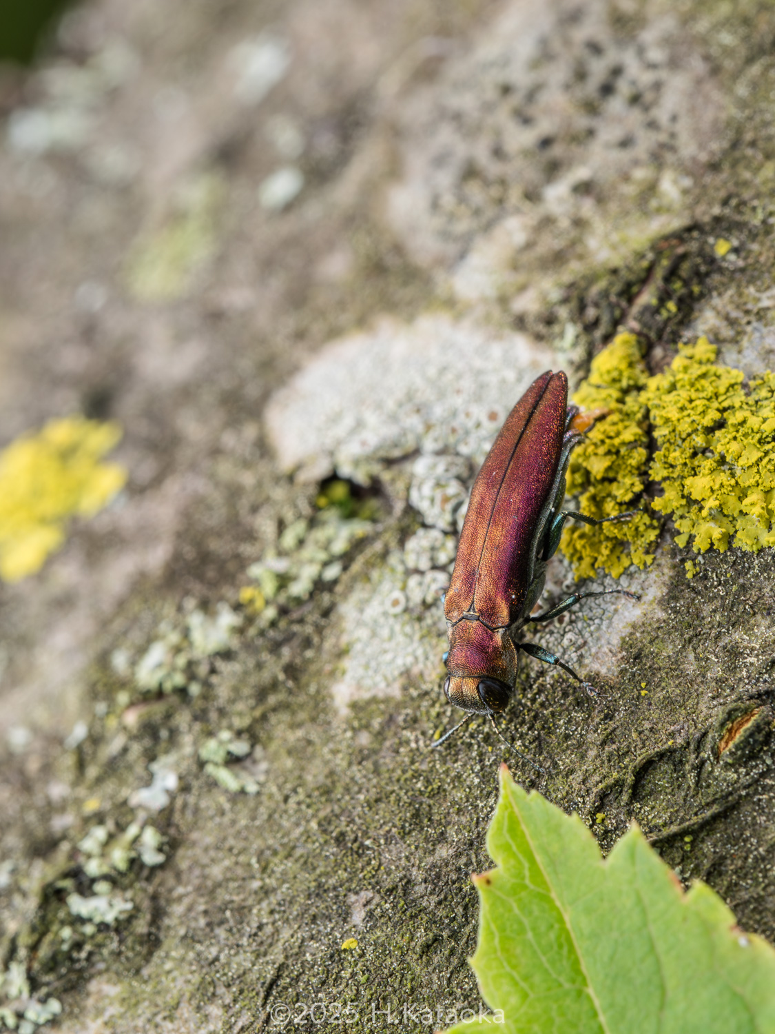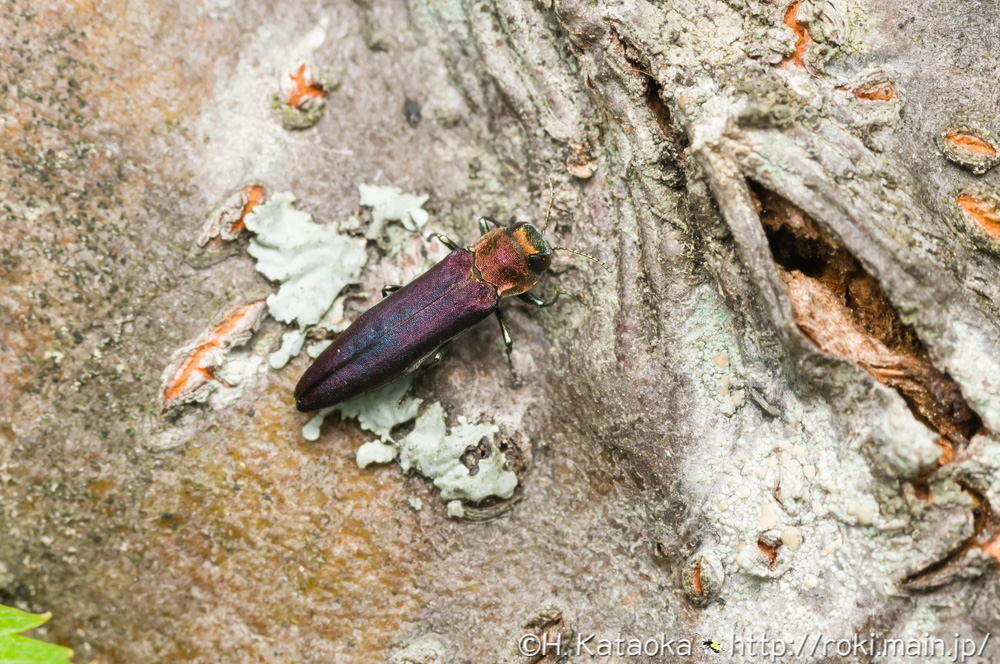 表面は紫がかった銅赤色、腹面は青銅色をしている美しいナガタマムシ。山地に生息し、ナナカマド・アズキナシの生木に集まる。特に林縁などの日当たりの良い場所にあるやや衰弱したナナカマドで見られる事が多く、樹幹で交尾・産卵している個体や、ヒコバエにとまる個体などが見られる。植栽されたナナカマドで発生している事もある。