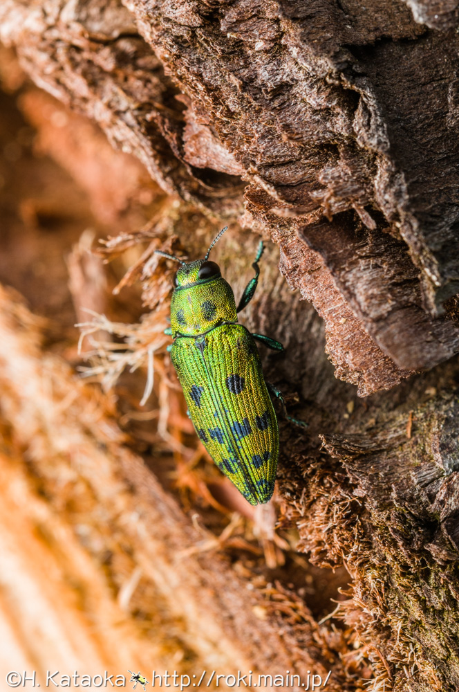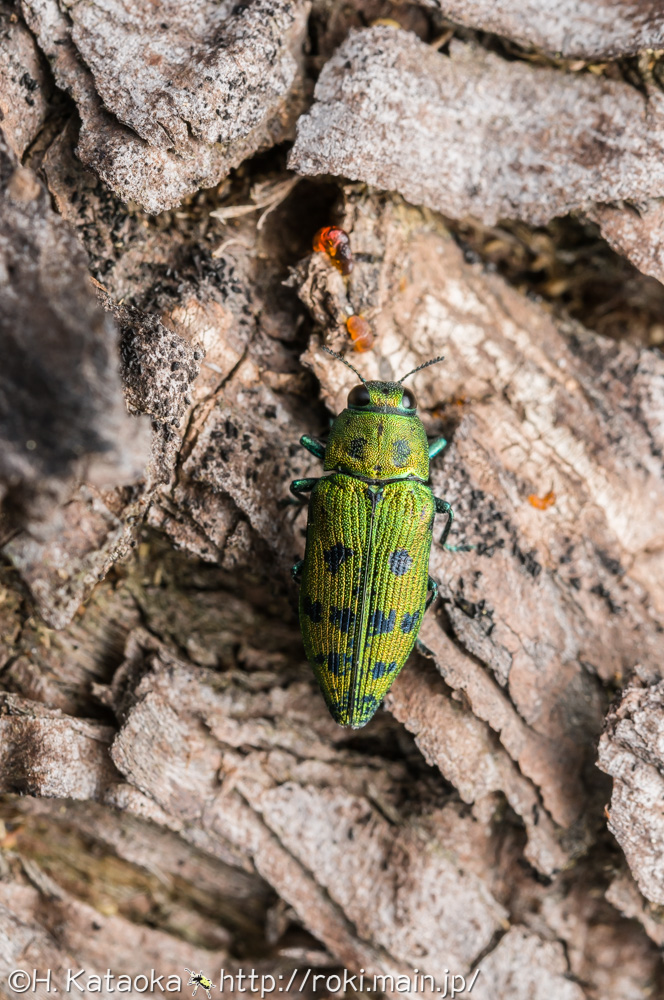 小型ながらとても美しいタマムシ。スギ・ヒノキ・ネズ等の伐採木や衰弱木に集まり、そこに産卵するほか、ハゼノキ・ヌルデ等の生木にも集まり、葉を後食する。スギ植林にも生息しており、スギの伐採木に来ているのをたまに見かけるが、多数が集まっている事は少なく、数匹がぽつぽつと見られる程度であることが多い。色彩には変異があり、緑色のほか、金緑色、青色、橙色、赤橙色を帯びた個体もいる。よく似た種にクロホシタマムシがいるが、クロホシタマムシは小楯板が台形をしている事などから区別する事が出来る。