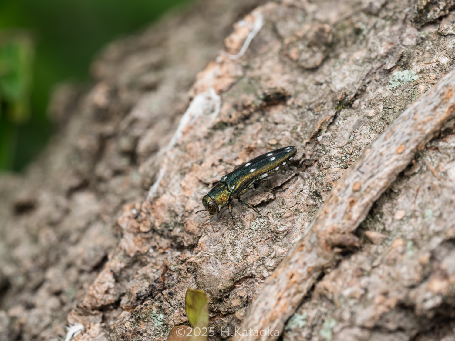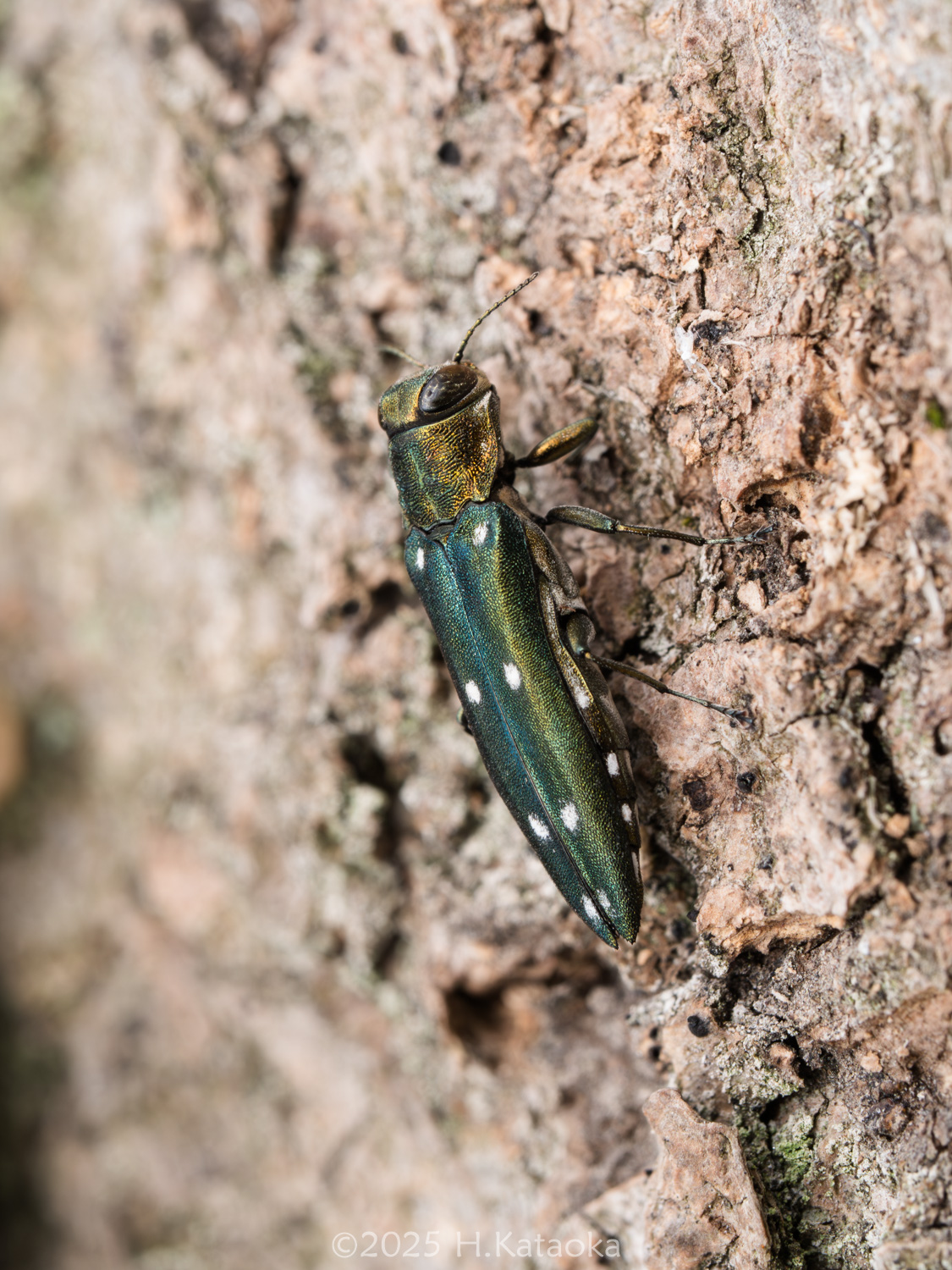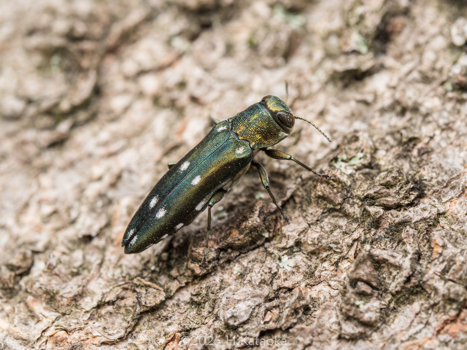 ナガタマムシとしては大型で、金緑色を帯びた上翅に白色紋を備えた美しい種。平野部~中山間部でやや普通に見られ、都市部の緑地や公園に生息している事もある。エノキ・エゾエノキの生木に集まり葉を後食するほか、それらの衰弱木や倒木・伐採木にも集まり、交尾・産卵する。条件の良い材さえ見つけられれば、かなりの高確率で見られ、複数個体が集まっている事も多い。