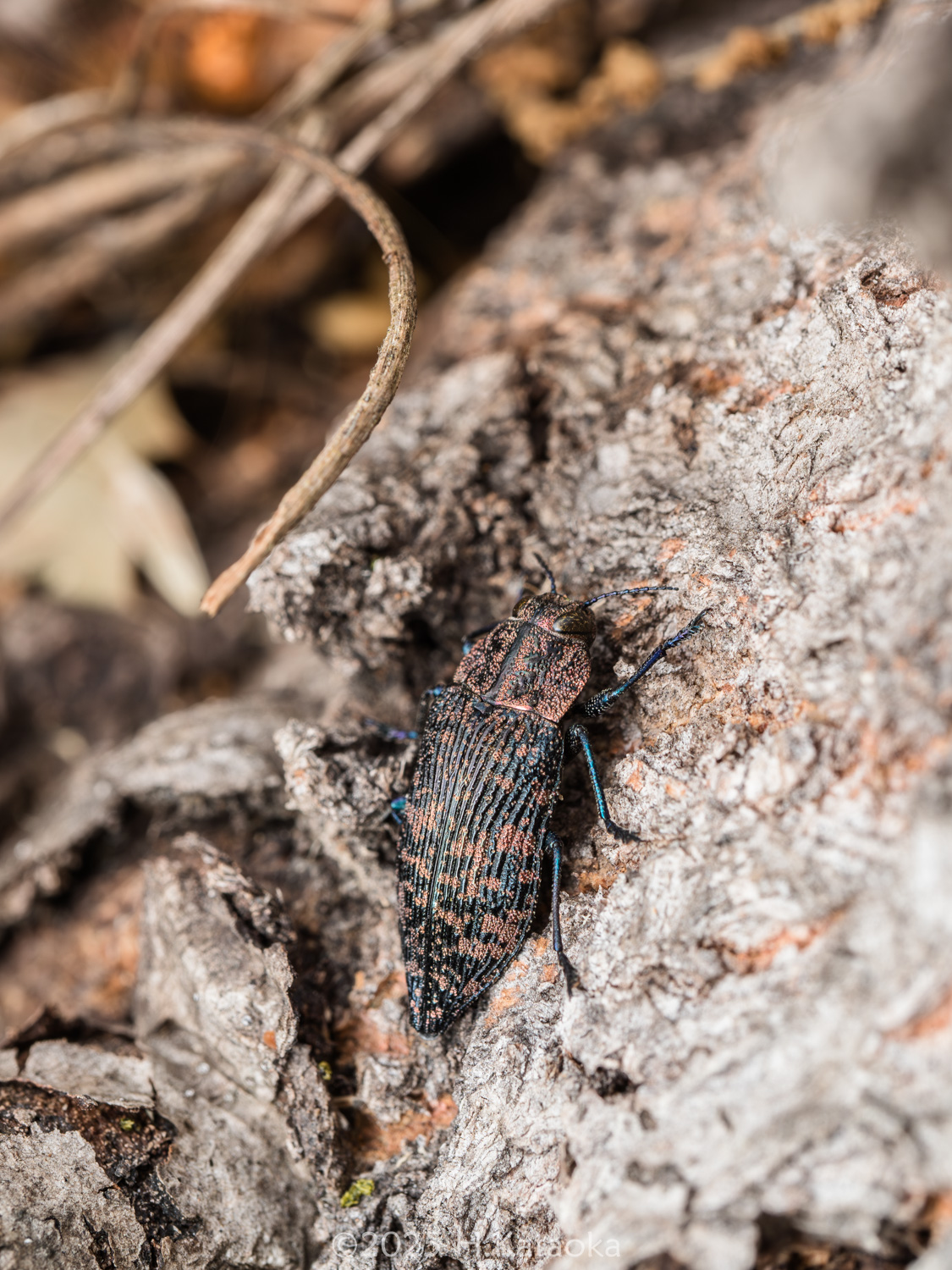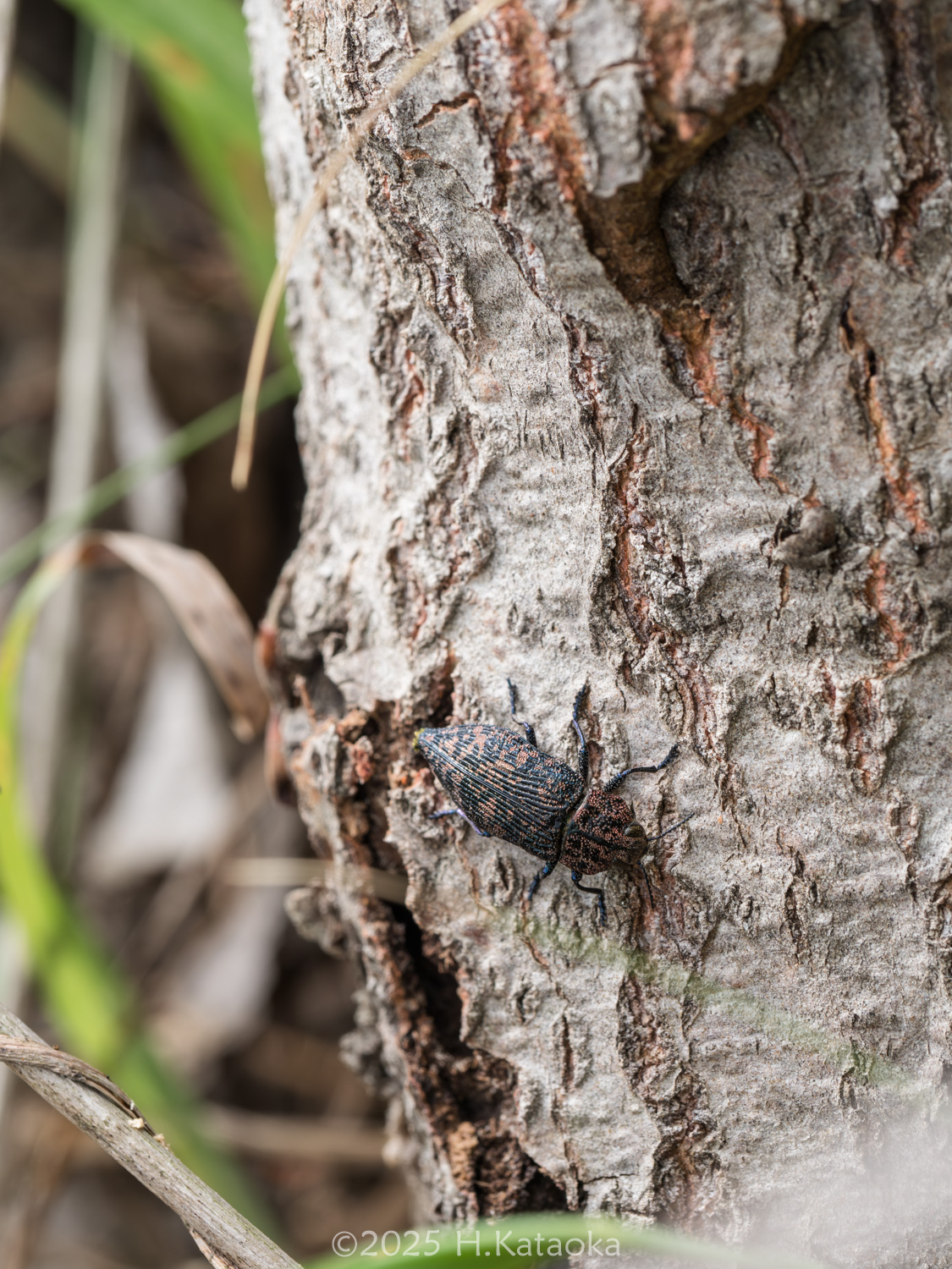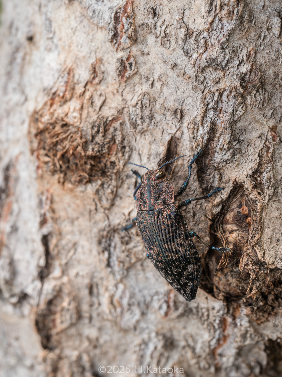 一見地味だが、よく見ると複雑な模様と色彩が美しい、いぶし銀のタマムシ。ドロノキ・ヤマナラシ等の衰弱木や衰弱部に集まり、交尾・産卵するほか、それらの葉を後食する。かつては大変珍しい稀種とされていたが、1994年に岡山県の造成地に生えるヤマナラシで多数発生しているのが発見され、生態が解明された。生息地ではヤマナラシの若木に多くの個体が見られ、その樹幹には本種の羽脱孔が多数確認できるほか、幹の直径が40㎝以上になるまで成長した木の衰弱部などにも羽脱孔が確認できる。