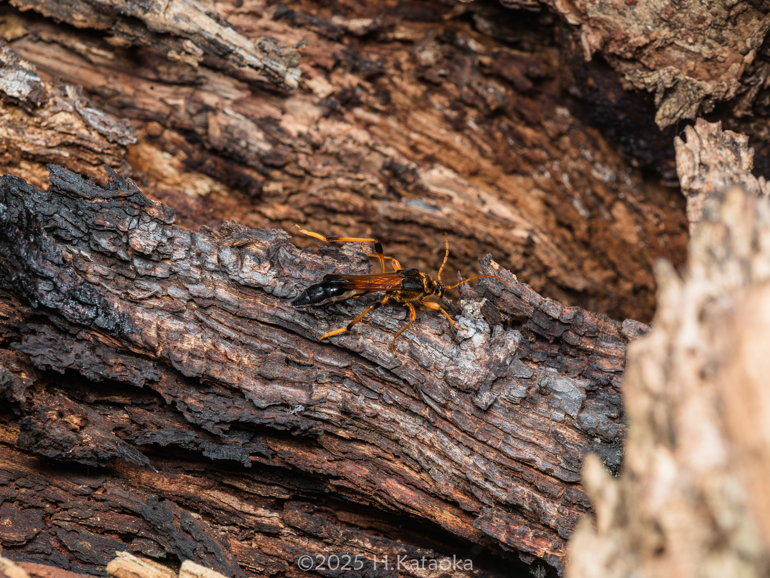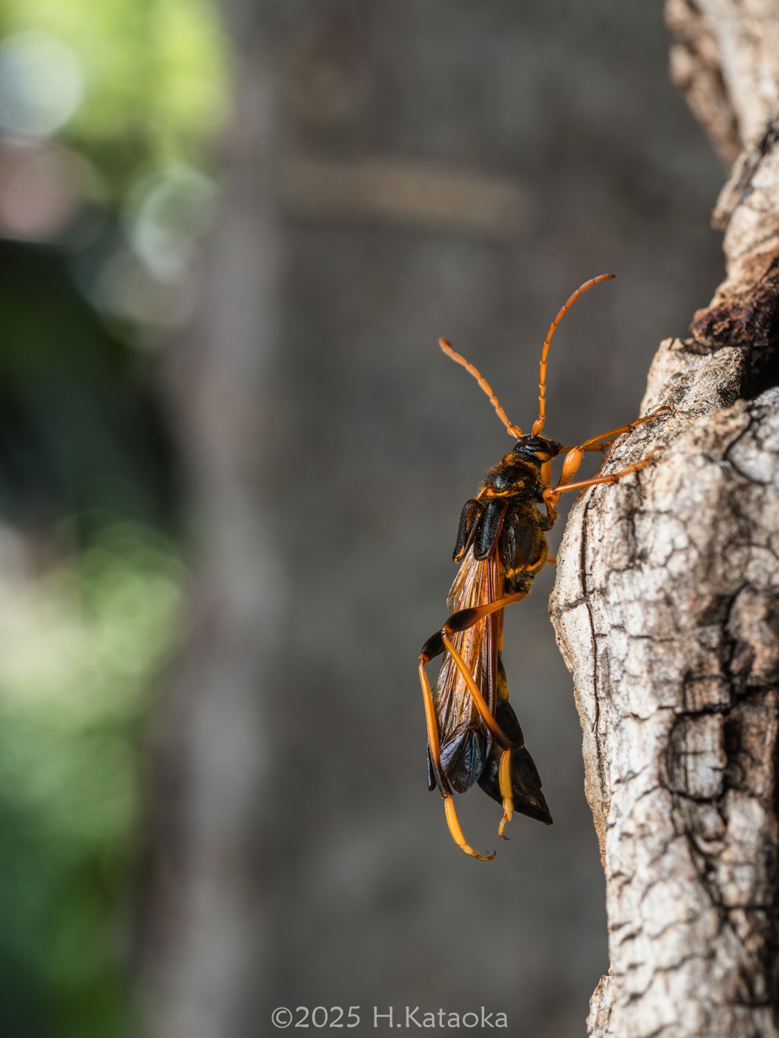 これは、まだいるに違いない!興奮冷めやらぬ中、追加を狙うべく各々クワのルッキングを再開した。すると程なくして、高さ5m程のところをハチのようなものが飛んでいるが目に入った。それはクワの葉めがけて、結構なスピードで飛んで来て、葉の周りを器用に旋回したかと思うと、「スッ」とクワの葉上にとまったのだった。飛び方からしてハチだろうなとは思いつつも、一応観察していると、次の瞬間、なんとそれは、器用に葉裏に回り込み、そのまま静止したではないか!ギガンだ!間違いない!「いたいたいた~!」慌ててNさんを呼び戻し、この個体も無事に確保する事が出来た。
