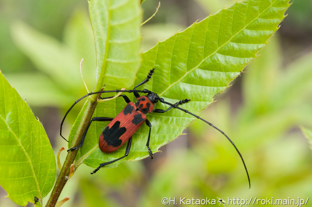 上翅にあるシルクハット型の黒紋がお洒落な少し大型のベニカミキリ。新緑の季節、クヌギ・コナラ・ナラガシワ等のひこばえに集まり、カミキリ亜科としては珍しく、葉や茎をフトカミキリのごとくバリバリと齧って後食する。メスはそれら樹木の伐採木や倒木にも集まり、そこに産卵する。生息地は限られるが、生息地での個体数は少なくなく、ひこばえが生える伐採地には多くの個体が集まり、交尾や後食する姿が各所で観察される。しかし、ひこばえで見られる期間は短く、少し時期を外すだけで全く見られなくなってしまう。さらに発生時期はその年の気象条件などによって1ヶ月ちかくもズレる事があるためタイミングを合わせるのが難しい。