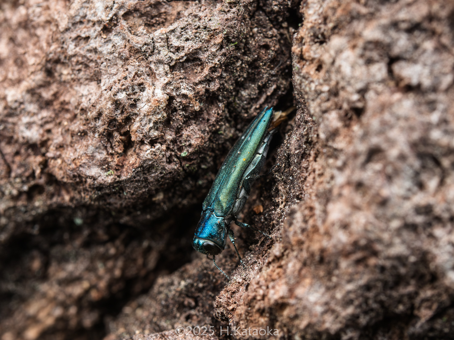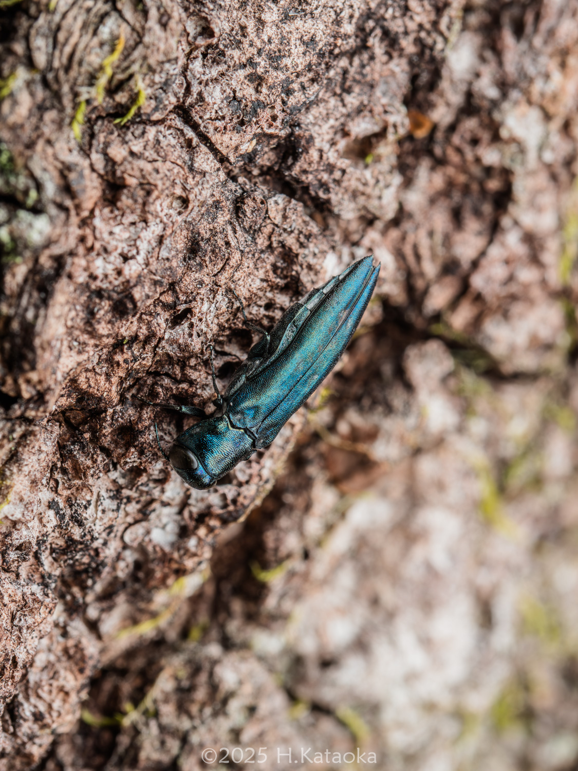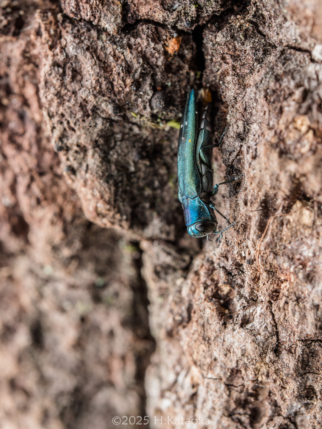 吸い込まれるようなブルーメタリックが美しい超美麗ナガタマムシ。クヌギ老大木の樹皮やクヌギの衰弱木に集まり、そこに産卵する。生息地は限られ、個体数も少ない珍しい種だが、近年、ナラ枯れによるクヌギの衰弱木の増加に伴って増えているようで、見かける機会が増えている。クヌギの大木がある程度まとまってあれば都市部の公園や緑地にも生息している事がある。