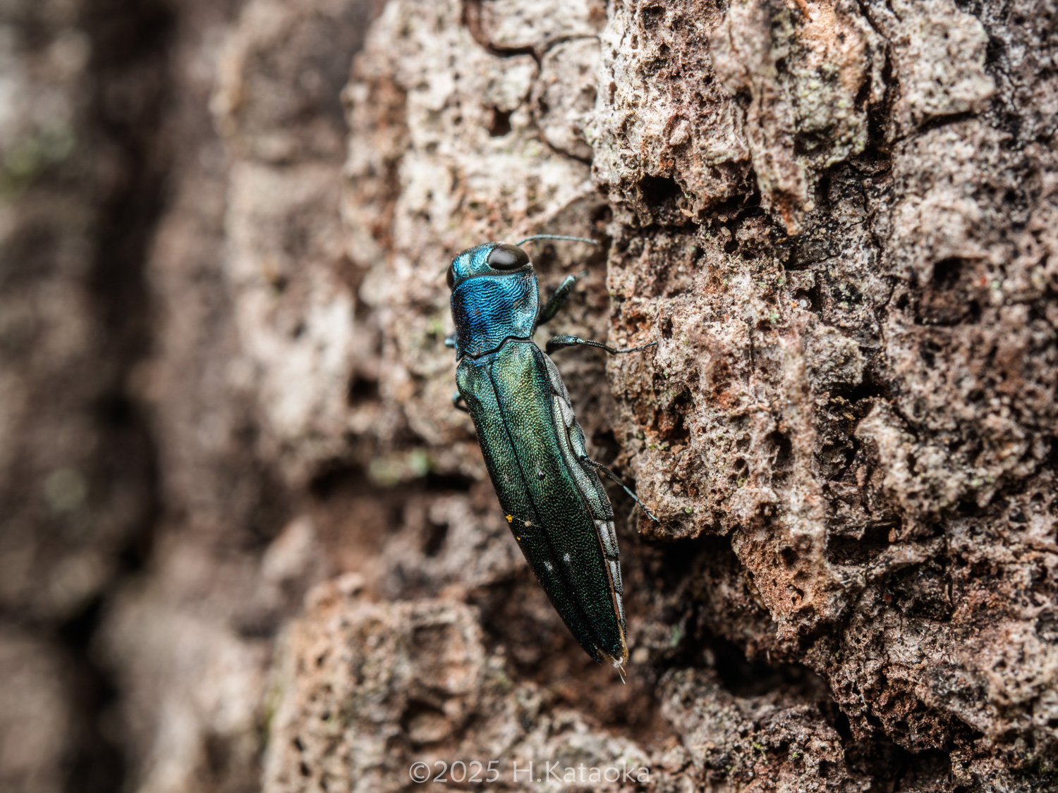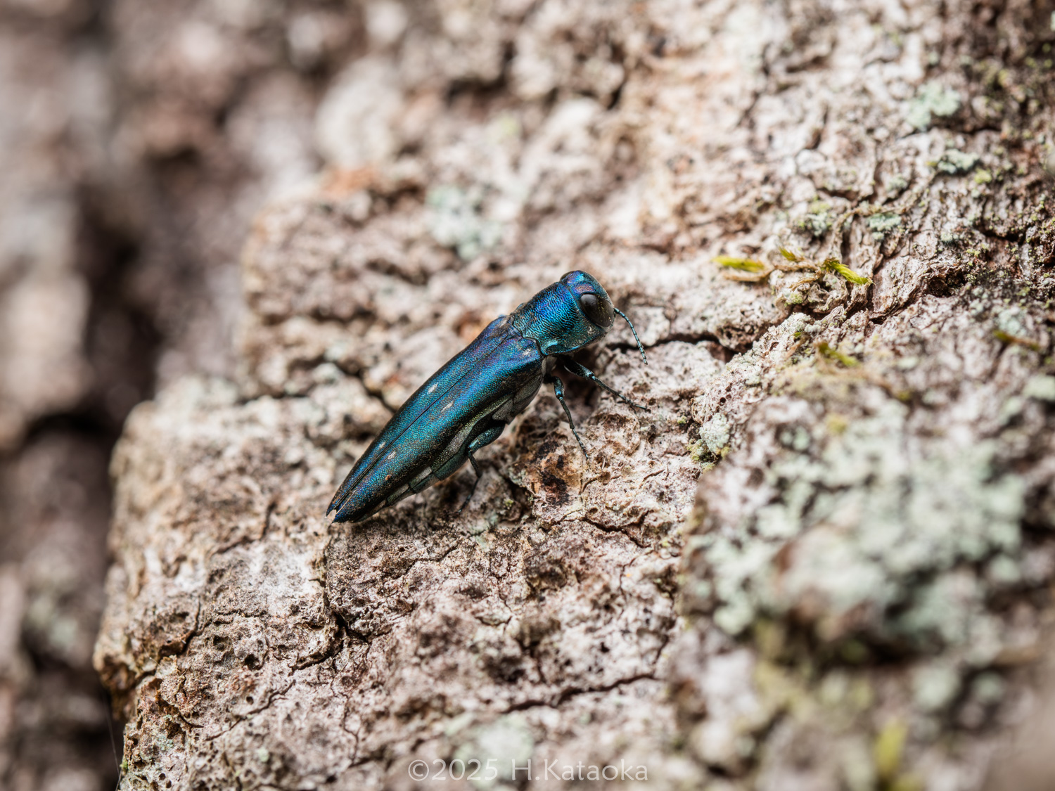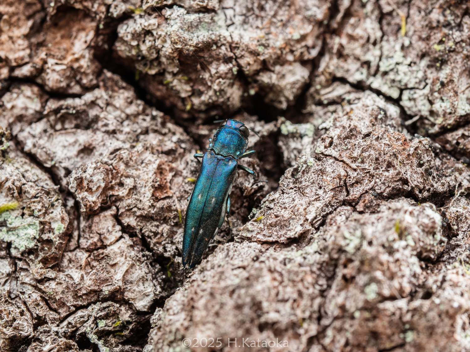 吸い込まれるようなブルーメタリックが美しい超美麗ナガタマムシ。クヌギ老大木の樹皮やクヌギの衰弱木に集まり、そこに産卵する。生息地は限られ、個体数も少ない珍しい種だが、近年、ナラ枯れによるクヌギの衰弱木の増加に伴って増えているようで、見かける機会が増えている。クヌギの大木がある程度まとまってあれば都市部の公園や緑地にも生息している事がある。